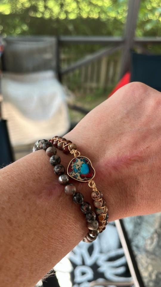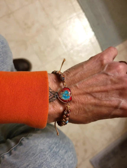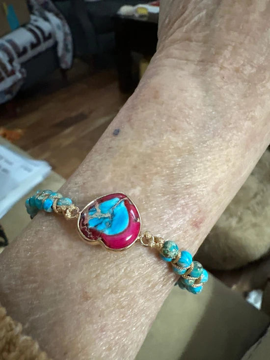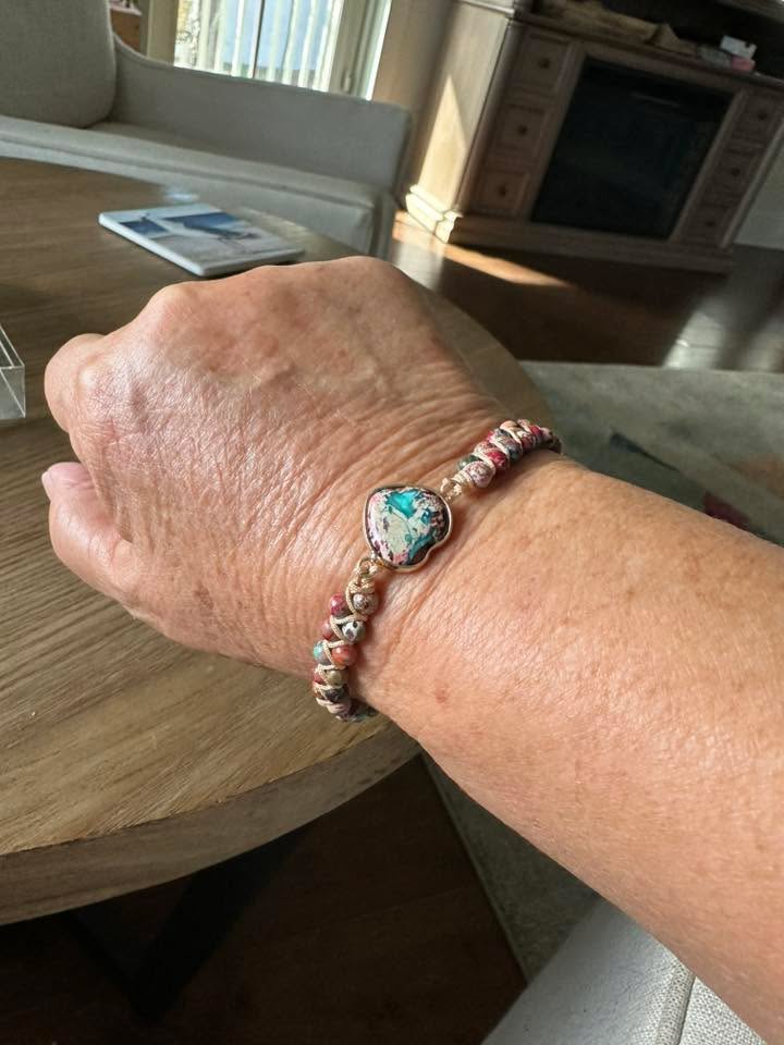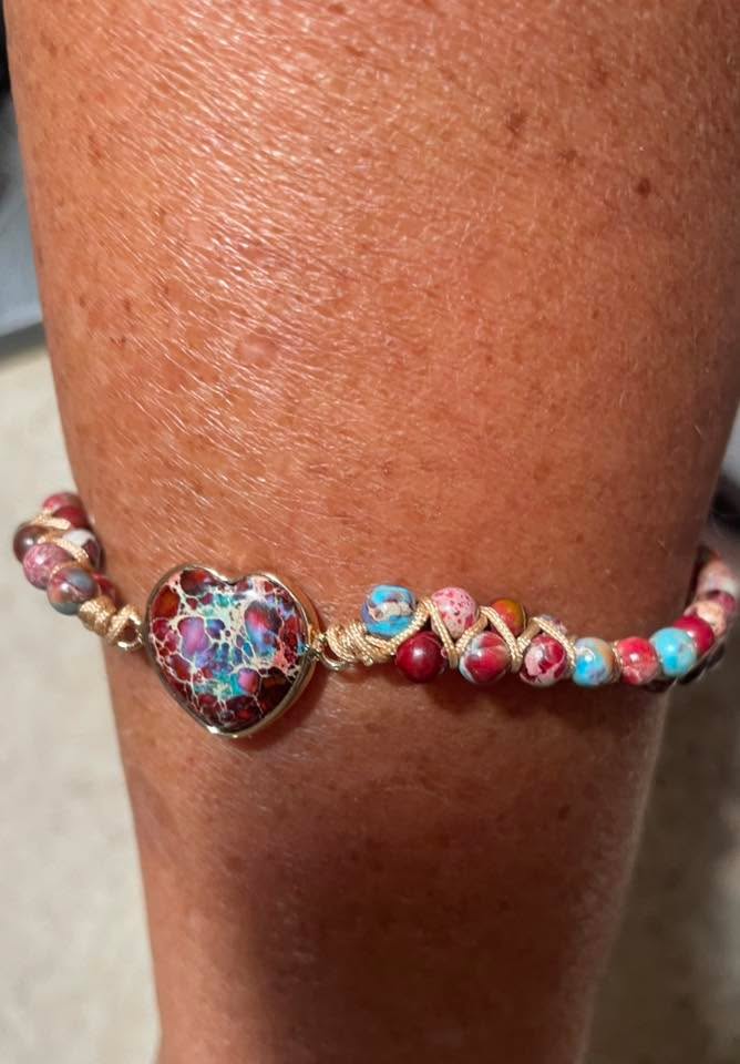 Each bracelet is handmade by our team of 5. The beauty is that each heart stone is unique, none of them are exactly the same.